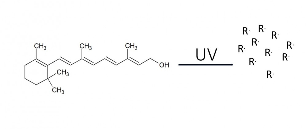 Suite à une irradiation du palmitate de rétinyle dans le domaine UVA et en présence de lipides, il se produit la formation d’espèces réactives de l’oxygène. On parle de lipo-peroxydation (Xia Q, Yin JJ, Cherng SH, Wamer WG, Boudreau M, Howard PC, Fu PP (2006) UVA photoirradiation of retinyl palmitate—Formation of singlet oxygen and superoxide, and their role in induction of lipid peroxidation. Toxicology Letters 163 (1) 30-43). Palmitate de rétinol et soleil ne font donc pas bon ménage. Il conviendrait de le préciser sur l’emballage des cosmétiques qui en contiennent.