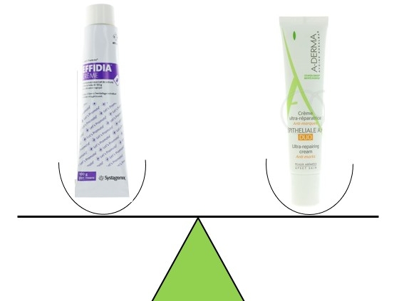 La crème Effidia et la crème Epitheliale ont plusieurs points communs. Toutes deux s’adressent à « une peau altérée ». L’argumentaire est mesuré du côté du cosmétique (« La Crème ultra-réparatrice Epitheliale AH DUO apaise et favorise la réparation épidermique des peaux fragilisées. ») (https://www.aderma.fr/fr-fr/epitheliale-ah-duo/creme-ultra-reparatrice), c’est normal étant donné le statut de ce produit-ci ; l’argumentaire est un peu plus « musclé » du côté du dispositif médical (« La crème Effidia est indiquée dans le traitement des irritations et des lésions cutanées. Elle permet notamment de couvrir les plaies aiguës et chroniques dues à des abrasions ou provoquées par des prélèvements de greffes. Elle soulage également les incisions opératoires, les brûlures du premier et du second degré ainsi que les ulcères vasculaires et métaboliques ou les escarres qui peuvent apparaître en cas de position allongée de longue durée, dits « décubitus » ») (https://www.pharma-gdd.com/fr/effidia-creme-tube-100-g), c’est tout aussi normal étant donné le statut de ce produit-là.