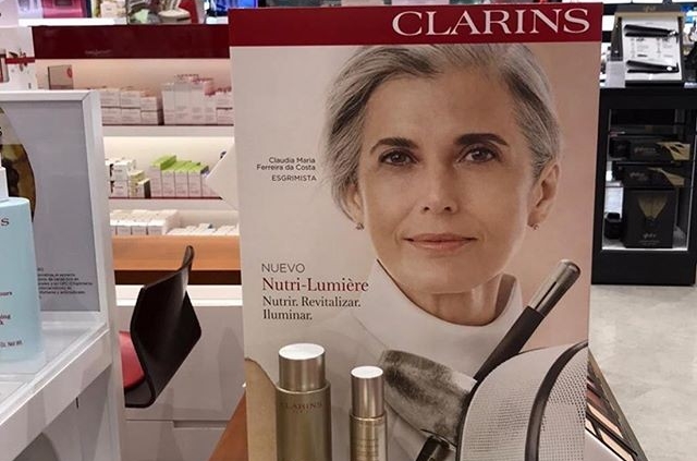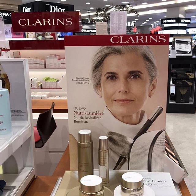 Les laboratoires Clarins ont choisi Claudia Maria Ferreira da Costa pour la promotion de leur nouvelle crème nutri-Lumière Jour, une « Innovation pro-ageing », « en faveur des peaux matures ». Mannequin et escrimeuse, cette Brésilienne fête aujourd’hui son anniversaire et, par là-même, ses 58 printemps (indice précieux pour connaître l’âge du public ciblé). Elle fait partie de la silver generation, ces femmes qui assument totalement leurs mèches grises… voire blanches.