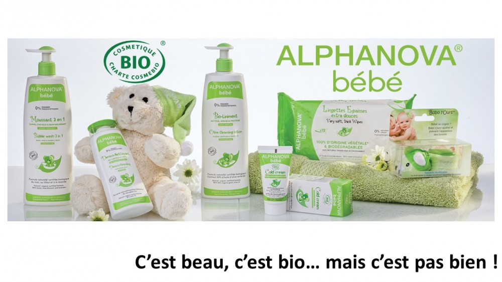 Le site Alphanova présente les arguments classiquement évoqués par l’industrie du Bio : « Les formules d’Alphanova bébé sont très respectueuses de bébé, de la nature et de l’environnement. » Les formules sont présentées comme « très douces car sans savon, sans sodium laureth sulfate » (http://www.alphanova.fr/fr/7-alphanova-bebe).