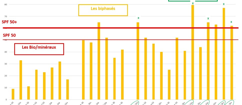 Si l’on s’intéresse aux produits minéraux, on constate que 100 % des produits affichent un SPF vraiment trop optimiste. L’écart moyen entre le SPF affiché sur l’emballage et celui déterminé par nos soins est de 23 unités (avec une amplitude allant de 21 à 43).