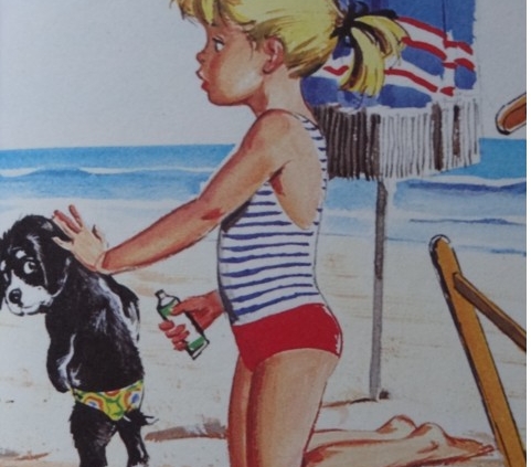 Date de parution : 1965. Pierre Probst, avant-gardiste, préconise déjà, pour ses jeunes lecteurs, les bonnes pratiques de plage (les BPP !), en glissant dans la main de Caroline un petit tube de crème qui, par la suite, deviendra le tube de l’été !