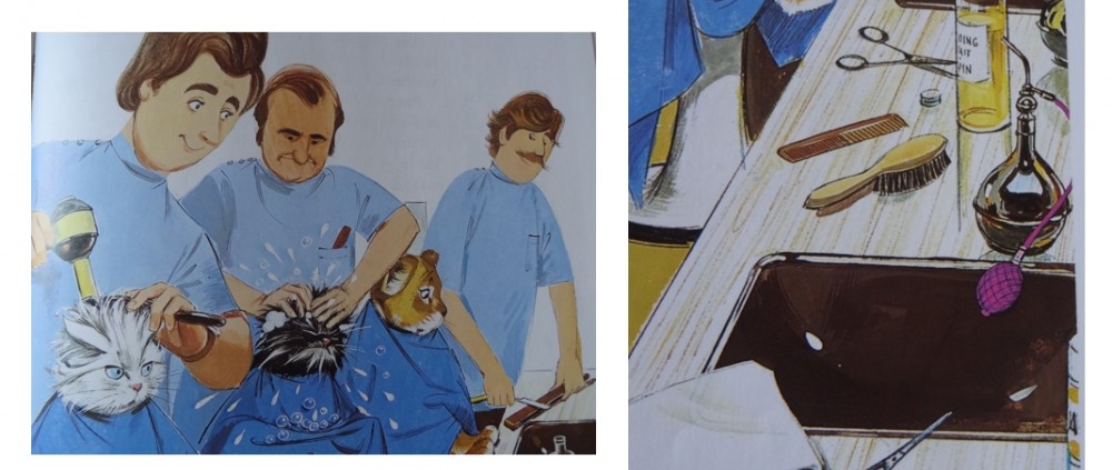 Oui, c’est une bonne idée, mais franchement faire un shampooing à un chat c’est délicat ! Si Pouf, le chat blanc, semble avoir plutôt apprécié, Noiraud, le chat noir, en revanche, souffre le martyr. Il faut dire que le coiffeur, peu délicat qui l’a pris en charge, lui met carrément les doigts dans les yeux. « De tous ces shampooings et de tous ces soins, les deux minets n’ont guère besoin », nous dit Pierre Probst qui compatit ! « Etre mouillé ne convient pas à leur nature ».