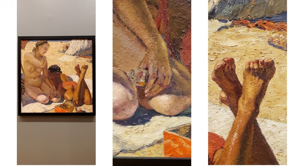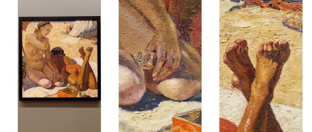 L’artiste nous montre deux femmes allongées sur une plage en plein soleil.