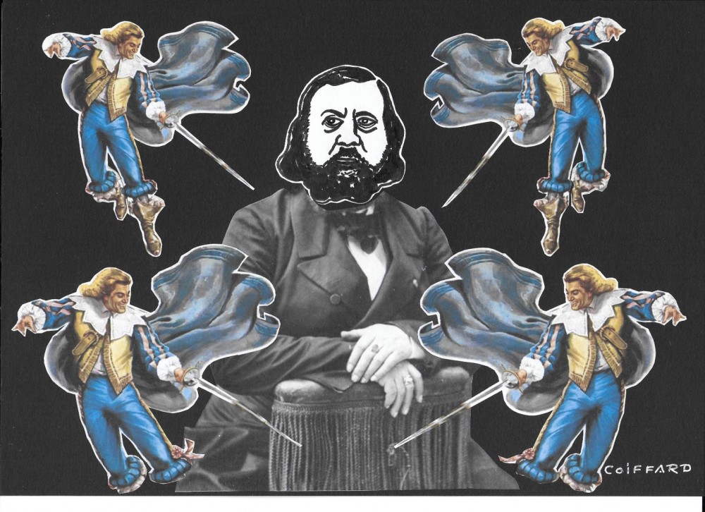 L’homme des basses œuvres… « Sur les joues décharnées deux ou trois rides perpendiculaires, pareilles à des coups d’épée, dessinaient leurs lignes rigides qui n’étaient pas précisément des nids d’amours. Une tignasse de cheveux noirs fort emmêlée pleuvait autour de cette physionomie bonne à sculpter sur un manche de violon et dont personne cependant n’avait envie de se moquer tant l’expression en était inquiétante, narquoise et féroce. » « Ses moustaches, poissées d’un cosmétique grossier, ressemblaient à une brochette dont on lui eût traversé la lèvre supérieure, et sa royale se retroussait comme une virgule mise à l’envers. »