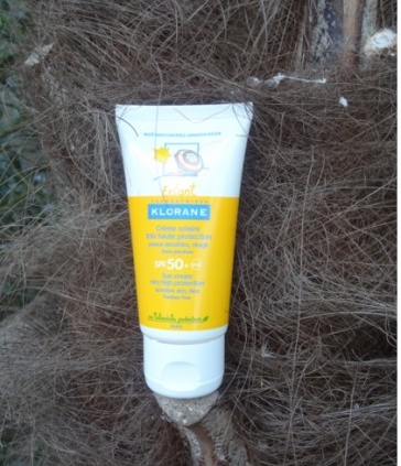 Crème solaire Klorane enfant 50+, la crème qui sent la pêche et donne la pêche !