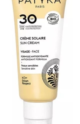 Patyka crème solaire visage face – formule antioxydante SPF 30 : Aqua (water), Caprylic/Capric triglycéride, pentylène glycol, zinc oxide, titanium dioxide, coco-caprylate/caprate, glycerin, polyglyceryl-6-stearate, parfum (fragrance), microcristalline cellulose, sodium hyaluronate, haematococcus pluvialis extract, aloe barbadensis leaf juice powder*, pongamol, tocopherol, helianthus annuus (sunflower) seed oil, prunus armeniaca (apricot) kernel oil*, polyglyceryl-3 polyricinoleate, polyglyceryl-6 behenate, xanthan gum, polyhydroxystearic acid, cellulose gum, sodium phytate, isostearic acid, cetearyl alcohol, glyceryl stearate, alumina, stearic acid, alcohol, citric acid.