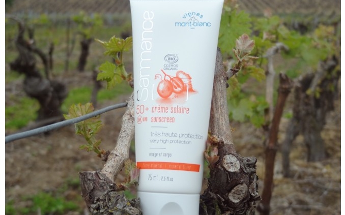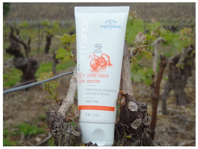 Le produit solaire Sarmance vignes mont-blanc 50+ nous propose une promenade entre vignoble (d’où le nom choisi pour la gamme) et montagne.1 On aurait autant préféré voir évoqué le mont Gerbier-de-Jonc, bien connu des petits Nantais qui apprennent, très tôt, que c’est là que la Loire qui traverse leur ville prend sa source.