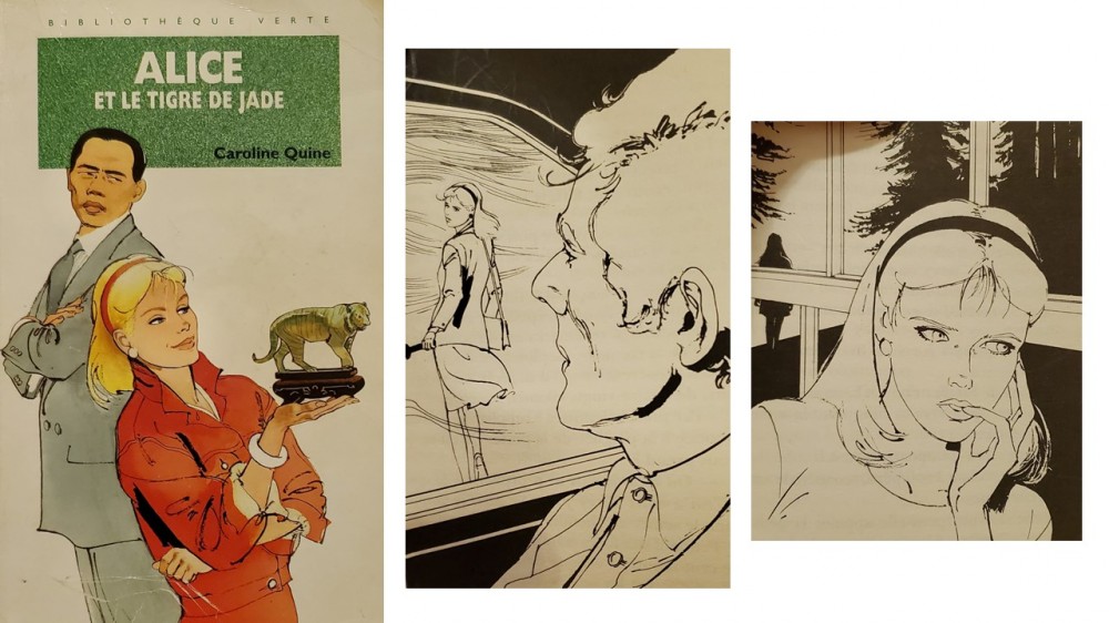 Mais qu’est-ce qui a pris à Caroline Quine de baptiser Bess, Marvin et non Taylor, Marion, Fayne et non Webb et Sarah, la fidèle gouvernante qui a élevé Alice, Green en lieu et place de Berny ?1 Quel charivari parmi les personnages que les lecteurs de la bibliothèque verte connaissent bien. Dans l’opus de 1991, Alice et le tigre de jade, Alice est invitée par son amie Joanne Koslow à son mariage (enfin aux préparatifs du mariage aussi, avec une salle à décorer et des plats à cuisiner !). Dans le même temps, James Roy propose à sa fille de jouer la baby-sitter dans une famille (les Kirkland, le père Terry et sa fille de 9 ans, Amy) dont la maison est régulièrement cambriolée. Heureusement, Joanne et les Kirkland habitent tout près les uns des autres. Du coup… ou plutôt faisant d’une pierre deux coups, Alice va pouvoir résoudre une énigme (une de plus !) et préparer un mariage en un temps express !