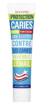 Enfilant sa blouse professorale, Monoprix passe au tableau et laisse les calembours au vestiaire. Les dentifrices pour adultes ou pour enfants sont fluorés. C’est le monofluorophosphate de sodium qui est choisi. Il est associé à du glycérophosphate de calcium pour un effet synergique. Entre la version « protection caries » et la version « blancheur », on constate un changement d’agent abrasif. Le carbonate de calcium (en 2e position de la liste des ingrédients) de la version « caries » est remplacé par une silice hydratée (en 3e position de la liste des ingrédients) de la version blancheur. La version blancheur se prend pour une mauvaise eau micellaire ou un mauvais masque capillaire, avec son chlorure de cétylpyridinium. Dans ces conditions, on optera pour la version « protection caries ».
