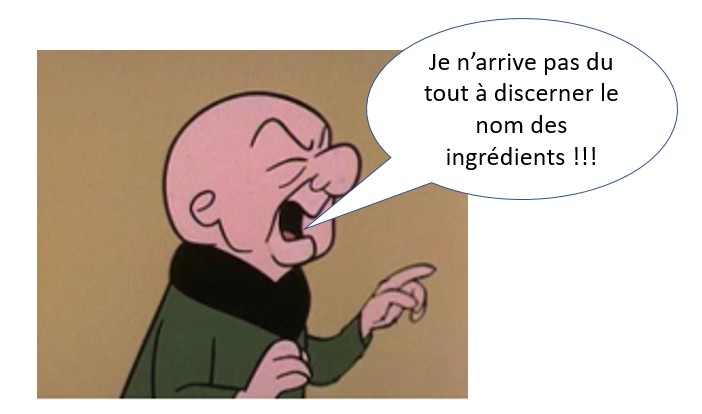 Mister Magoo qui aime à comparer les produits qu’il achète aimerait que les ingrédients soient toujours présentés avec des caractères de taille réellement visible…