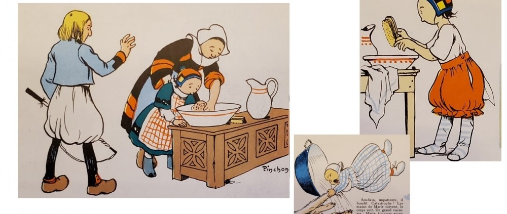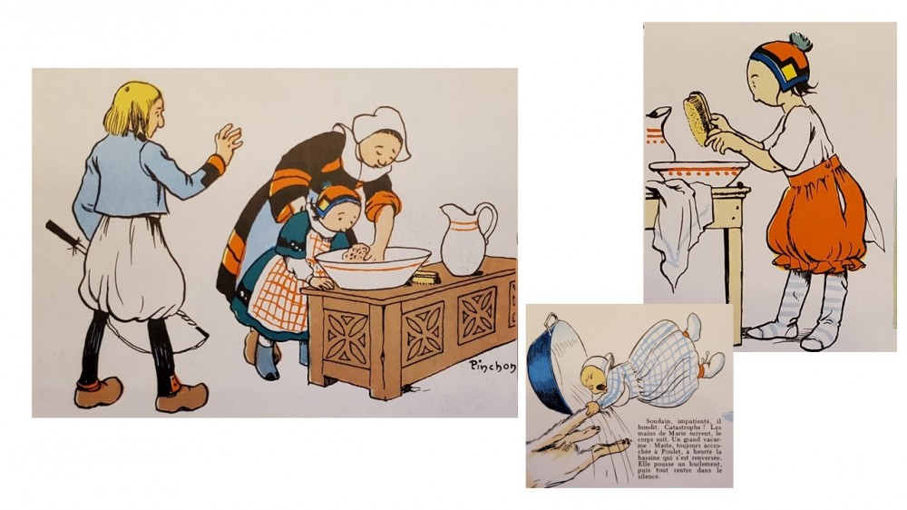 Bécassine n’aime guère l’heure de la toilette. Elle a, c’est du moins sa mère qui le dit, un jour, fait preuve d’une volonté féroce pour y échapper. Couchée dans le même berceau que sa cousine Marie Quillouch, Bécassine aurait renversé la bassine prête pour son bain et envoyé sa cousine dans le coffre à farine… On l’aura compris, Bécassine n’y est pour rien dans cette aventure. C’est le chat Poulet qui est à l’origine de tout ce carnage.