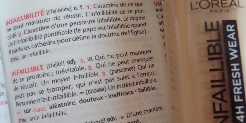 Le fond de teint Infaillible de L’Oréal est un fond de teint qui est loin de militer pour la semaine des 35 heures ; on nous promet qu’il résiste à tout, donne un teint frais et naturel, et est intransférable (No transfert).1 Cela en donnerait presque le tournis, tant son dynamisme est important.