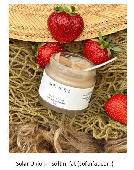 Solar Union Sun support balm : Grassfed&finished tallow, cold pressed jojoba oil, emu oil, local beeswax, hypericum perforatum (St. John’s wort), calendula officianalis, matricaria chamomilia, vitamin e (non-gmo, sunflower derived)