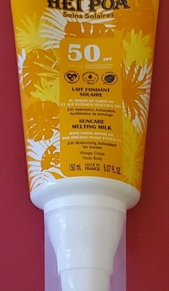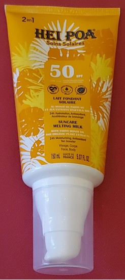 Lait fondant solaire Hei Poa SPF 50 : AQUA (WATER), CAPRYLIC/CAPRIC TRIGLYCERIDE, TRIETHYL CITRATE, DICAPRYLYL CARBONATE, BIS-ETHYLHEXYLOXYPHENOL METHOXYPHENYL TRIAZINE, DIETHYLAMINO HYDROXYBENZOYL HEXYL BENZOATE, DIETHYLHEXYL BUTAMIDO TRIAZONE, GLYCERIN, PROPANEDIOL, ORYZA SATIVA (RICE) STARCH, CETEARYL ALCOHOL, HYDROGENATED DIMER DILINOLEYL/DIMETHYLCARBONATE COPOLYMER, BRASSICA CAMPESTRIS (RAPESEED) SEED OIL, POTASSIUM CETYL PHOSPHATE, LAURYL GLUCOSIDE, POLYGLYCERYL-2 DIPOLYHYDROXYSTEARATE, COCOS NUCIFERA (COCONUT) OIL, PARFUM (FRAGRANCE), GARDENIA TAITENSIS FLOWER EXTRACT, CISTUS MONSPELIENSIS EXTRACT, STEVIA REBAUDIANA EXTRACT, SESAMUM INDICUM (SESAME) SEED OIL, GLYCINE SOJA (SOYBEAN) OIL, HYDROXYACETOPHENONE, 1,2-HEXANEDIOL, MICROCRYSTALLINE CELLULOSE, POLYGLYCERYL-3 DIISOSTEARATE, TYROSINE, XANTHAN GUM, CELLULOSE GUM, TOCOPHEROL, CALOPHYLLUM INOPHYLLUM SEED OIL, ETHYLHEXYLGLYCERIN, GLYCERYL STEARATE, CITRIC ACID.