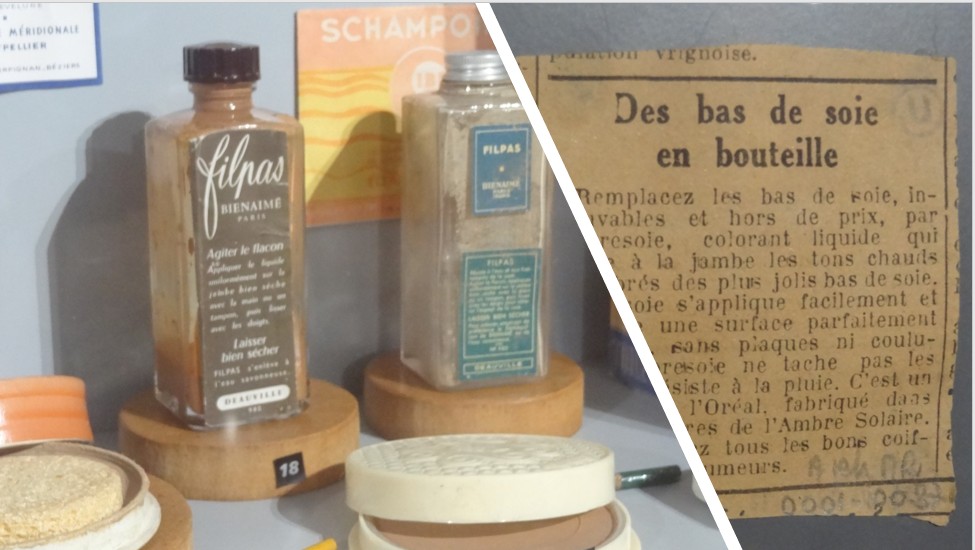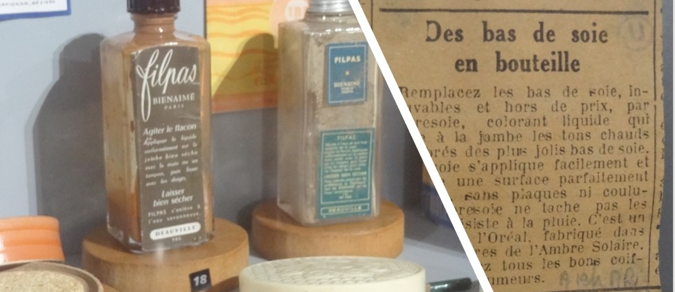 Durant la Seconde Guerre mondiale, les bas de soie (les vrais !) ne sont plus que des souvenirs. La pénurie est là… Les pâtes à l’eau utilisées par les professionnels du spectacle descendent alors dans la rue. L’Oréal se met de la partie et commercialise « Ambresoie », « un colorant liquide qui donne à la jambe les tons chauds et ambrés des plus jolis bas de soie ». Les réclames – nom donné, à cette époque, aux publicités – que l’on peut lire dans les journaux vantent les mérites de ce fond de teint qui s’applique facilement « sans plaques ni coutures »… Il ne manquerait plus que cela, qu’un faux bas de soie ait une couture comme un vrai de bas de soie… A propos de couture, pour celles qui souhaitent imiter les bas à la perfection, il est possible de faire l’achat de deux produits de teintes différentes. Le plus clair sera utilisé pour teinter l’ensemble de la jambe ; le plus foncé permettra de tracer au pinceau une belle ligne droite à l’arrière de celle-ci !