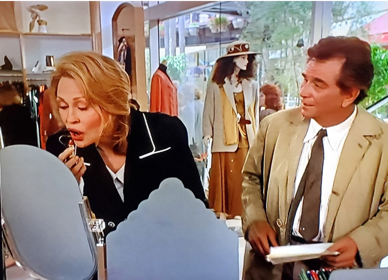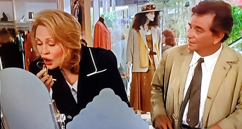 Alors que Lauren vient d’entrer dans une boutique de vêtements, Columbo lui tombe dessus. De quoi risquer de faire filer le rouge à lèvres tout juste essayé. Lauren nous surprend en s’emparant du tube de rouge à lèvres qui est là en tant que testeur. Au lieu de tester la couleur sur le dos de sa main, elle n’hésite pas à s’en tartiner les lèvres. Beurk !