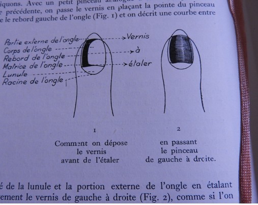 Le vernis est appliqué de manière scientifique. Dans son « Formulaire de parfumerie », le pharmacien René Cerbelaud se veut pédagogue. « Il est coutume de ne pas appliquer de Vernis (notons la majuscule pour désigner ce cosmétique on ne peut plus noble) sur la lunule et sur l’extrémité de l’ongle, chose très facile en opérant comme nous l’indiquons. Avec un petit pinceau, on passe le vernis en plaçant la pointe du pinceau contre le rebord de l’ongle et on décrit une courbe entre l’extrémité de la lunule et la portion externe de l’ongle en étalant progressivement le vernis de gauche à droite, comme si on faisait un lavis sur du papier. » Des schémas viennent à l’appui de cette brillante démonstration. René Cerbelaud insiste également sur le fait que les vernis sont « en grande vogue en Angleterre et aux Etats-Unis ».10 Une pose de vernis qui souligne l’aspect rosé de l’ongle et qui respecte la blancheur du bord libre… une pose d’un vernis Revlon qui vient tout droit d’Amérique… il n’en faut pas plus pour concocter ce que l’on a l’habitude d’appeler la « French manucure ».
