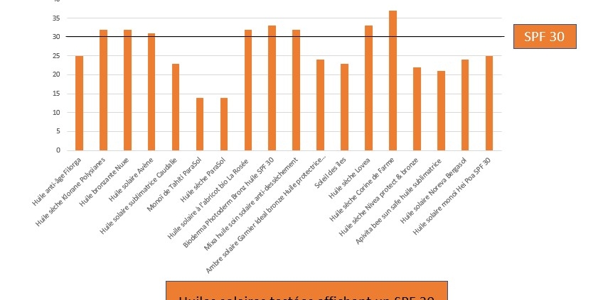 Sur les 25 huiles solaires testées cette année, 44 % sont aussi efficaces qu’elles le prétendent. Dit autrement : 56 % des produits de notre échantillon s’avèrent décevants, avec des performances en matière de protection vis-à-vis des UVB bien trop justes. Nous rappellerons au passage que dans un souci d’équité fort compréhensible toutes les huiles étudiées ont été testées en suivant un protocole parfaitement identique, ce qui permet, en toute transparence, de décerner des bons et des mauvais points de manière extrêmement justifiée.