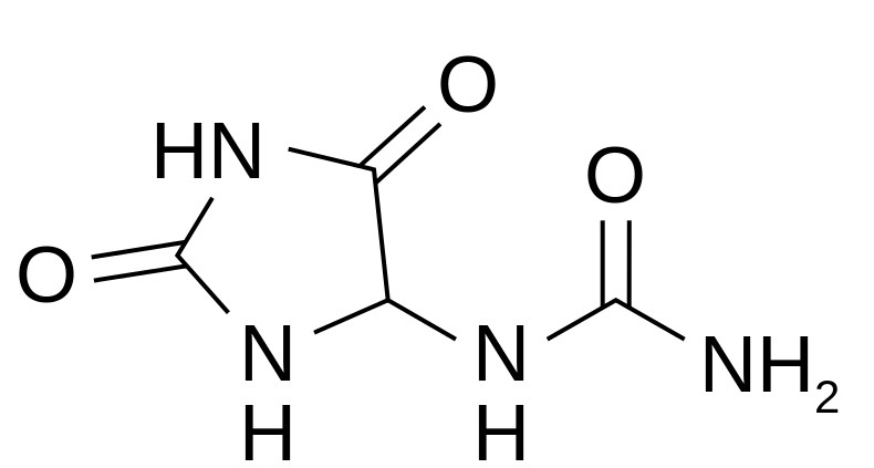 L’allantoïne est une molécule très présente dans le milieu végétal. On la classe dans la catégorie des « protecteurs cutanés ». Le Merck index la définit comme un vulnéraire, c’est-à-dire un principe actif capable de guérir les plaies. La FDA la considère comme un principe actif sûr et efficace, pouvant être incorporé dans les médicaments OTC à des doses allant de 0,5 à 2 %, afin d’assurer une protection vis-à-vis des « coupures, éraflures, brûlures, boutons de fièvre et coups de soleil », de « prévenir et de protéger la peau et les lèvres contre les gerçures, les irritations et brûlures », de traiter le phénomène de sécheresse cutanée. Ce principe actif adoucissant permet de calmer les irritations, tant au niveau interne qu’externe. Au niveau gastro-intestinal, il assure un rôle de protecteur et de réparateur des tissus lésés.7 Le Vidal ne fait état que d’une spécialité médicamenteuse en renfermant ; il s’agit de la pommade Cicatryl. Celle-ci renferme comme principes actifs de l’acétate de tocophérol, du gaïazulène, du p-chlorométacrésol et de l’allantoïne.9