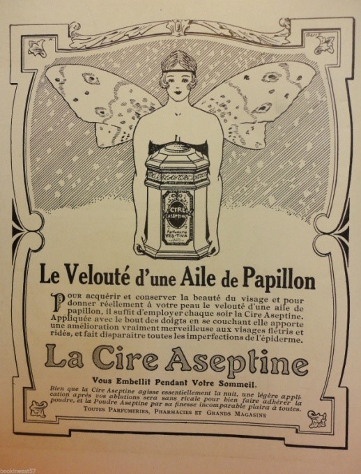 Notre pharmacien aime l’histoire. Pour vendre sa préparation, il ne remonte pas aux temps bibliques comme l’adresse de sa pharmacie pourrait l’y conduire. Il se contentera de remonter au XVIe siècle. Il nous parle de la maîtresse de Henri II, Diane de Poitiers dont « la beauté est restée légendaire. » Celle-ci « prodiguait à son corps des soins intelligents » nous indiquent les publicités de la célèbre Cire. On passera sous silence la nature de ces « soins intelligents » car on en ignore tout. On fait un bond dans le temps et on se retrouve illico aux soins modernes (« C’est à la science et à l’hygiène » que l’on demande désormais de résoudre l’équation qui permet d’accéder à la beauté éternelle). La Cire Aseptine, est, bien entendu, le produit scientifique qui permettra d’atteindre l’objectif recherché. « Il suffit d’étendre chaque soir et pendant quelques jours la Cire Aseptine sur le visage et de l’enlever le matin avec de l’eau tiède. En enlevant peu à peu sans que vous vous en doutiez ou les autres s’en aperçoivent, la première couche de l’épiderme, la Cire Aseptine, après quelques applications, met à jour, une peau douce, délicate, veloutée. » Donc la Cire Aseptine est une crème de nuit… Cette crème de nuit donne à la peau « le velouté d’une aile de papillon ». Cette cire vous « embellit pendant le sommeil ». Toutefois, elle peut continuer son action le jour. Appliquée (en touches légères) après les ablutions elle est « sans rivale pour bien faire adhérer la poudre Aseptine » (publicité 1923).