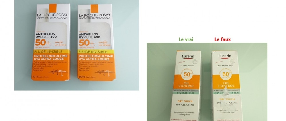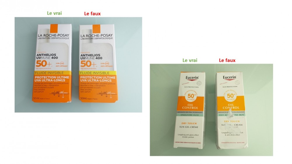 Pour notre part, nous nous sommes procuré des produits solaires contrefaits ayant l’apparence du fluide invisible Anthelios UVMune 400 et du gel-crème Eucerin Oil control, deux produits affichant un SPF 50+.