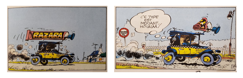 1973, Gaston Lagaffe fait de la publicité pour « Razara, la crème à raser ».1 Avec un tube de crème factice fixé sur le toit de sa guimbarde, Gaston fait des kilomètres… sans se soucier des frais d’essence, puisque la société qui le paie couvre ses frais. Tout va très bien sur le territoire français… mais à la douane… c’est un peu plus compliqué, surtout si on tombe sur un douanier pointilleux, bien décidé à savoir ce que contient ce volumineux tube de crème.
