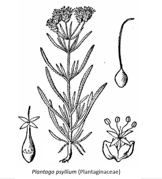 Reste à parler du plaintain pucier (Plantago psyllium) ou psyllium vrai, qui tire son nom de l’aspect de sa graine, pas plus grosse qu’une puce. Cette Herbe aux puces, présente dans les régions méditerranéennes, et exploitée pour sa graine dont la richesse en mucilage (10 à 12 % du poids total de la graine) est bien connue et en fait un laxatif mécanique.4