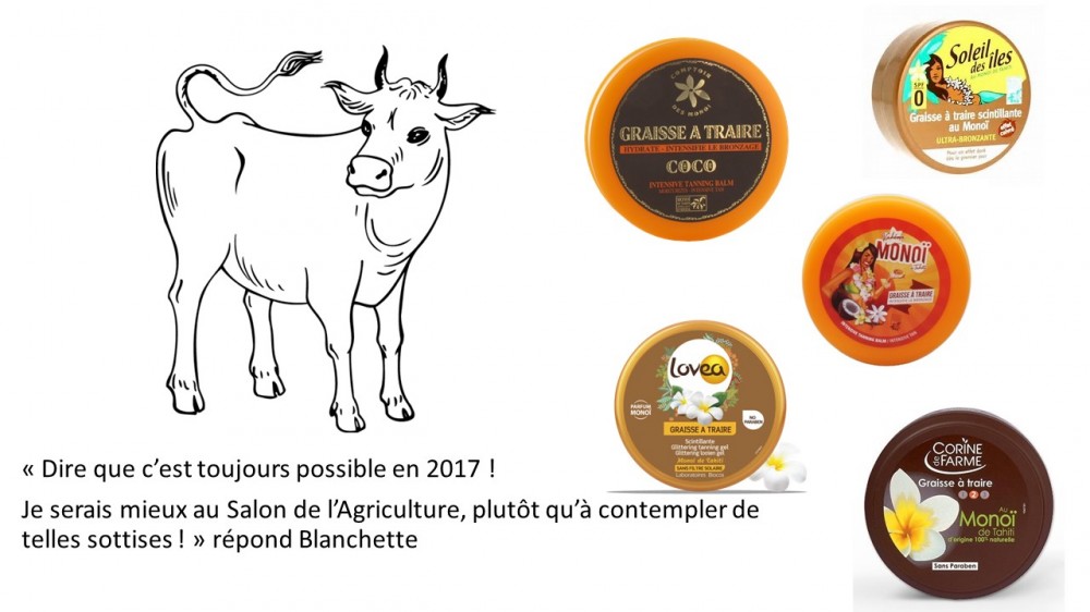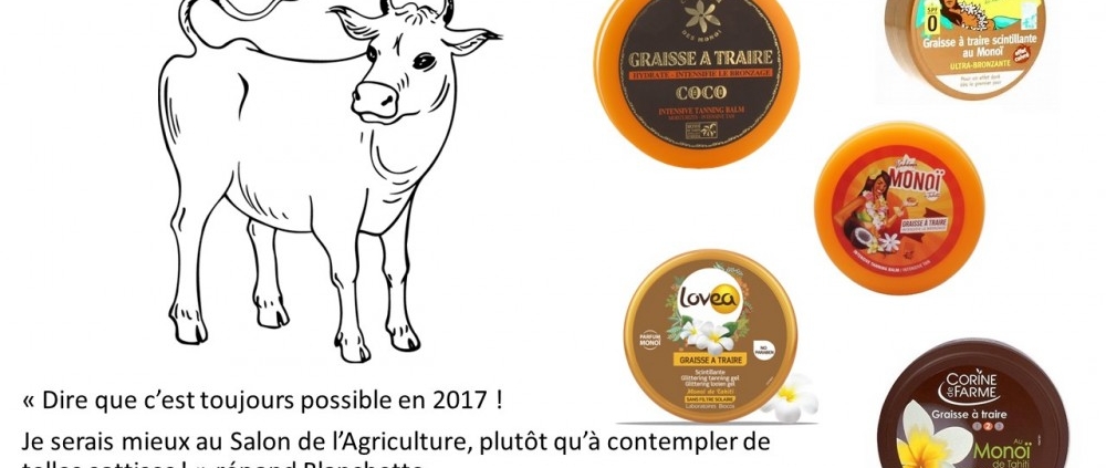 « Pour un bronzage à faire pâlir d’envie votre entourage, la graisse à traire au Monoï de Tahiti est l’indispensable de vos vacances. Conçue pour les peaux mates ou déjà bronzées, sa formule enrichie en Monoï de Tahiti aux vertus hydratantes satinera votre peau, tout en y laissant un entêtant parfum exotique aux notes d’Ylang Ylang et de tiaré… ».1 Voilà bien un argumentaire qui va à l’encontre du message de santé publique qu’il est important de faire passer.