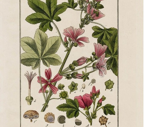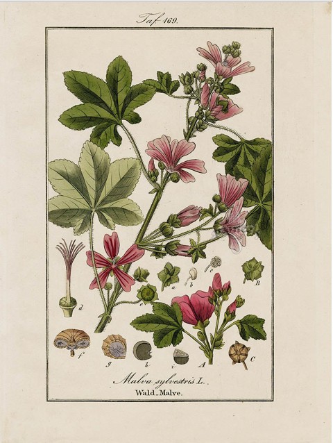 Par la suite, on a continué à employer les feuilles et les fleurs de mauve afin de réaliser des tisanes, « à propriétés béchiques, anti-inflammatoires, antitussives ». Espèce pectorale donc… au même titre que le coquelicot, le bouillon blanc, la guimauve ou la violette,8 mais pas que ! L’émollience obtenue peut, en effet, être exploitée par d’autres voies. Des lavements ont ainsi pu être mis au point et administrés.9 Ainsi que des cataplasmes, des liniments, des préparations pour gargarismes…10