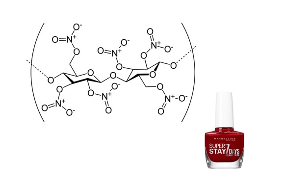 Non, sûrement pas. La nitrocellulose utilisée dans les formules de vernis à ongles est un ester nitré, obtenu par la réaction d’un mélange d’acides nitrique et sulfurique avec un alcool (c’est-à-dire, un des groupes hydroxyle sur la cellulose). La cellulose obtenue à partir du coton, du bois6 ou de tout autre matériel végétal est, en revanche, bien évidemment, naturelle, ce qui amène certains abus de langage dans le cas de sociétés pratiquant le greenwashing à outrance.