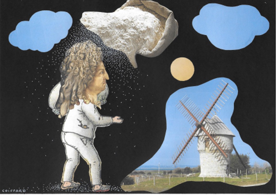 Arriver « la goule enfarinée » est une expression qui prend son origine dans une fable de Jean de La Fontaine (1621-1695) « Le chat et le vieux rat ».3 Il y est question d’un « vrai Cerbère » qui voulait « de souris dépeupler tout le monde ». Afin de le tromper, le chat, plein de ressources, « blanchit sa robe et s’enfarine », afin de se faire passer pour ce qu’il n’est pas.4 Des goules enfarinées et des perruques de même, il n’a certainement pas manqué d’en rencontrer à la cour de Louis XIV… Le poudrage des perruques se fait effectivement à cette époque avec de l’amidon de blé. Depuis l’Antiquité, on tient en haute estime la poudre d’amidon, une poudre obtenue à partir du grain de blé. L’amidon (étymologiquement « la poudre obtenue sans le secours de la meule ») est alors fabriqué à partir du grain de blé qui est mis à tremper dans l’eau pendant plusieurs jours ; lorsqu’il est bien ramolli, on le presse dans un linge, on le sépare du gluten, on le fait sécher au soleil, on l’écrase et on le triture à la main.5 La farine ou l’amidon de blé constitue, à partir du règne de Louis XIV, et ce jusqu’à la Révolution, le cosmétique capillaire par excellence. On la pulvérise directement sur les cheveux ou sur les perruques selon le cas.