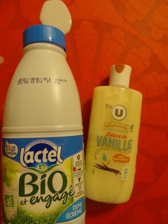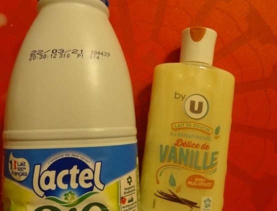 Les magasins U nous proposent, en ce moment, un lait de douche à l’extrait naturel de vanille de viscosité importante, de teinte vanille, d’odeur vanille.
