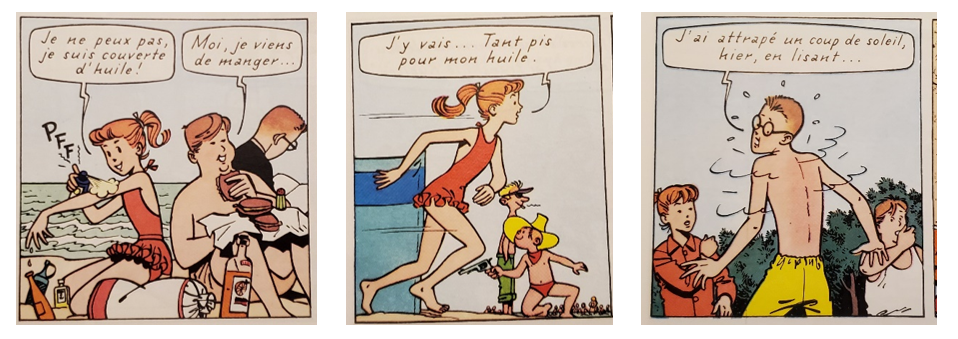 Dans cet opus, il est question de vacanciers, d’exposition solaire ; Dina met toutes les chances de son côté avec un chapeau à larges bords (qui fait d’ailleurs bien rire les garçons), des lunettes solaires et une huile photoprotectrice. Doct, quant à lui, bien qu’érudit dans le domaine de la philosophie, n’y connaît goutte en matière de santé cutanée ; pas de protection, mais un beau coup de soleil à la clé !