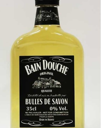 Confusion entre une flasque de whisky et un produit pour la douche. Confusion entre une boisson et un cosmétique. Interdit !