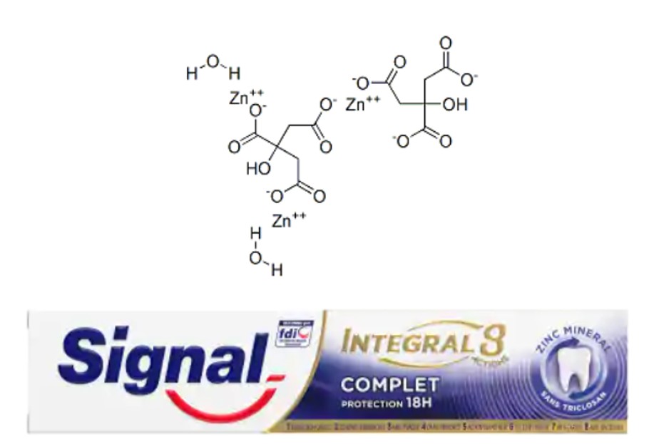 Le citrate de zinc (CAS : 546-46-3 ; EC : 208-901-2) est répertorié à l’inventaire européen comme un agent anti-plaque utilisable dans les produits d’hygiène buccodentaire. Présent à l’Annexe III (au n°24) du Règlement (CE) N°1223/2009, le citrate de zinc, comme la plupart des sels de zinc hydrosolubles, est autorisé à hauteur de 1 % exprimé en zinc dans les produits cosmétiques.19 Un petit calcul s’impose donc afin de savoir quelle dose limite de citrate de zinc peut être employée. C’est la seule difficulté rencontrée pour cet ingrédient connu et reconnu.