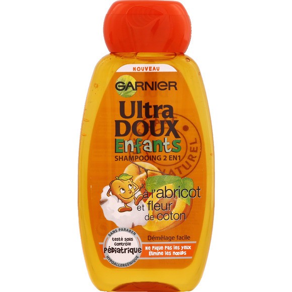 On peut toutefois avoir des surprises à la lecture de la liste des ingrédients. C’est le cas avec le shampooing 2 en 1 à l’abricot et fleur de coton (Garnier) destiné aux enfants :