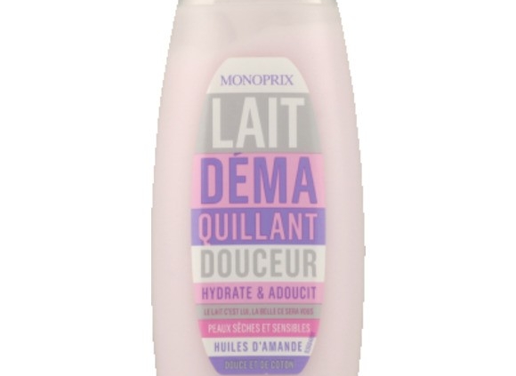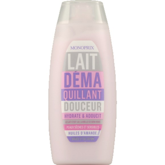 Lait démaquillant douceur Monoprix : Aqua, Isopropyl palmitate, Glycerin, Caprylic/capric triglyceride, Glyceryl stearate, PEG-100 stearate, Cetearyl alcohol, Dimethicone, Carbomer, Panthenol, Sodium benzoate, Parfum, Butylene glycol, Potassium sorbate, 1,2-hexanediol, Caprylyl glycol, Xanthan gum, Nelumbo nucifera flower extract, Sodium hydroxide, Sorbic acid.