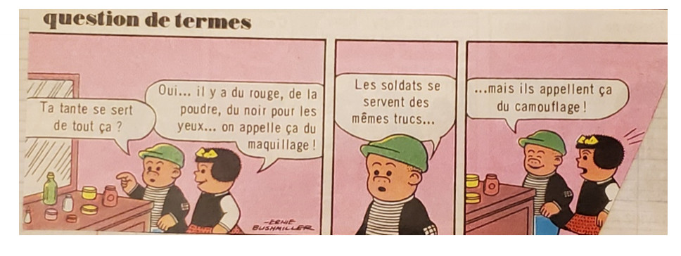 Pour Arthur, changement de point de vue. Les produits de maquillage ne sont que des « trucs » un peu bizarres, qui lui rappellent les produits de camouflage utilisés par les militaires en opération.