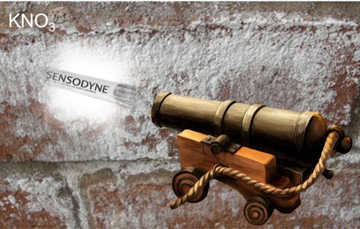 L’hypersensibilité dentinaire est due à la mise à nue de la dentine qui n’est plus protégée par l’émail dentaire. Les tubules dentinaires sont ainsi exposés à différents stimuli, ce qui aboutit à une sensation douloureuse. Ceci peut survenir en cas d’érosion de l’émail ou en cas de rétraction de la gencive. Un brossage trop énergique en est souvent la cause. C’est en 1974 que l’on a démontré l’effet désensibilisant d’une pâte dentifrice renfermant 5 % de nitrate de potassium.12