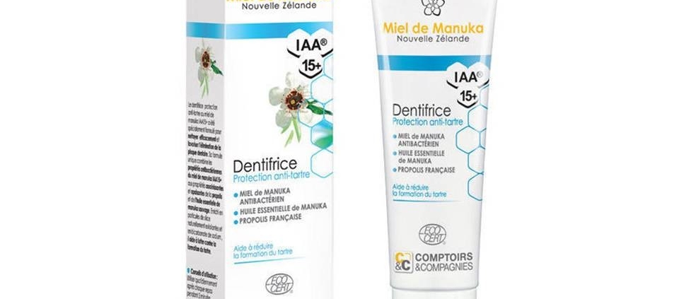 Dentifrice Bio Anti-tartre au Miel de Manuka (Comptoirs et Compagnies) : Calcium carbonate, Glycerin, Aqua , Mentha piperita leaf water, Silica, Alcohol, Lauryl glucoside, Mel, Sodium bicarbonate, Chondrus crispus powder, Xanthan gum, Maris sal, Eucalyptus globulus leaf oil, Mentha arvensis flower/leaf/stem extract, Citric acid, Rosmarinus officinalis leaf oil, Citrus limon peel extract, Sodium fluoride, Stevioside, Salvia sclarea oil*, Propolis wax, Leptospermum scoparium branch/leaf oil, Limonene, Linalool.