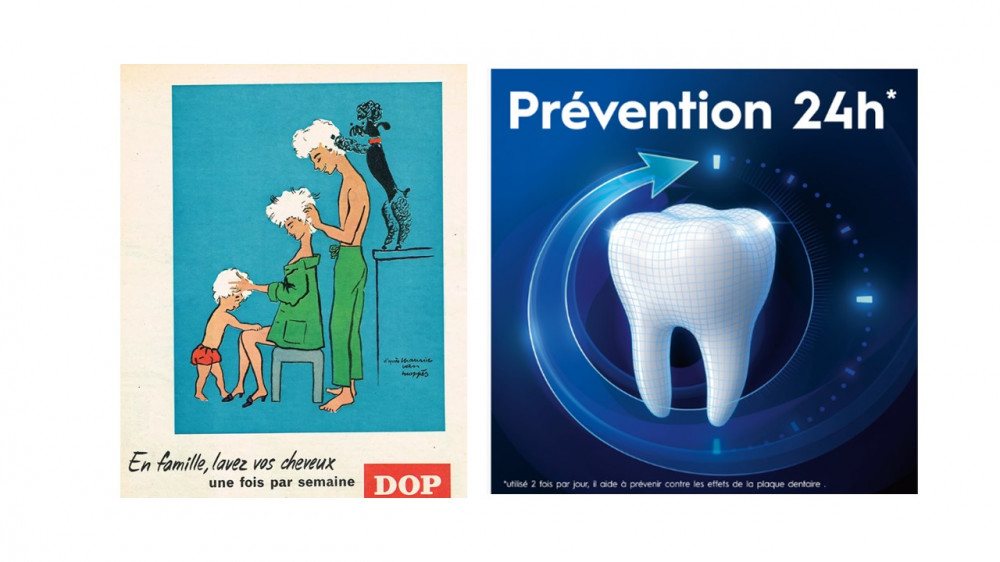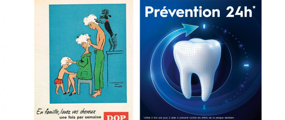 Le shampooing Dop constitue, évidemment, une référence dans le domaine de l’hygiène personnelle. En bon commerçant, Eugène Schueller décide de mettre en scène des familles entières réalisant un shampooing par semaine. Le but est de dire « non » à la crasse, à la saleté et de dire « oui » à la propreté et aux bonnes odeurs associées. Dans les années 1930-1950, les appartements, les maisons sont loin de disposer, de manière systématique et massive de salle de bains, ce qui impose une certaine gymnastique en matière d’hygiène corporelle et capillaire. Manquant de temps, d’espace, le Français du début du XXe siècle renâcle à pratiquer une toilette régulière… L’industrie cosmétique, qui se préoccupe de la santé des Français, mais également de son chiffre d’affaires, multiplie alors les campagnes publicitaires, afin de favoriser l’hygiène. Un bain, un shampooing pratiqué une fois par semaine… une efficacité qui doit durer… 168 heures ! Ce n’est pas l’idéal, mais c’est mieux que rien ou pas grand-chose !