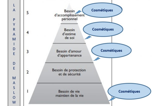 C’est en 1943, que le psychologue américain Abraham Maslow expose sa théorie, A Theory of Human Motivation, pour la première fois. Selon lui, les besoins humains – sachant que selon le dictionnaire Larousse, un besoin se définit comme une « exigence née d’un sentiment de manque, de privation de quelque chose qui est nécessaire à la vie organique ». – peuvent être hiérarchisés et une représentation de forme pyramidale peut être proposée et le besoin d’estime de soi se situe au niveau 4. A la base de la pyramide (niveau 1), on va classer les besoins essentiels de l’homme que l’on va qualifier de vitaux : respirer (l’oxygénation doit être correcte), boire (pour maintenir l’équilibre hydrominéral), manger (pour maintenir l’équilibre alimentaire), éliminer les déchets du métabolisme (uriner, déféquer, suer), dormir, se vêtir (maintenir sa température centrale). On va ajouter se laver ce qui permet de démontrer l’implication des cosmétiques (d’hygiène seulement, bien sûr) dans ces besoins fondamentaux. Le niveau 2 correspond au besoin de sécurité tant sur un plan physique (se loger, vivre dans un état en paix) que psychologique (besoin de sérénité). Le niveau 3 fait référence au besoin d’appartenance (à un groupe social) : toute personne a besoin d’être objet d’amour et d’affection. Il s’agit pour elle de se sentir acceptée dans un ou des groupe(s) dans le(s)quel(s) elle vit comme le cercle familial, amical, associatif… Tous les cosmétiques peuvent être concernés par ce niveau. Il en est de même des niveaux 4 et 5 qui correspondent respectivement au besoin d’estime de la part des autres (reconnaissance, bonne réputation) et de la part de soi-même (sentiment d’être utile, valorisé, atteindre ses buts) et au besoin de s’accomplir (épanouissement personnel). Comme ces besoins sont hiérarchisés, un besoin de niveau supérieur ne peut en principe être comblé tant que celui du niveau inférieur ne l’est pas. Pour Olivier Smallwood, « l’image de soi est un élément décisif du bien être psychologique et à ce titre, semble faire partie de la notion de santé telle qu’elle est définie par l’OMS, à savoir « un état de complet bien-être physique, mental et social, et ne consiste pas seulement en une absence de maladie ou d’infirmité ».2