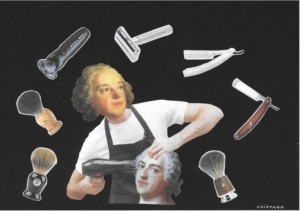 Figaro est un barbier aux multiples talents.1 Il sait aussi bien parler à l’oreille des chevaux – il a, effectivement, débuté sa carrière comme garçon apothicaire dans les haras d’Andalousie (« Je vendais souvent aux hommes de bonnes médecines de cheval… »), que manier plumes ou rasoirs avec dextérité (« […] fatigué d’écrire, ennuyé de moi, dégoûté […]