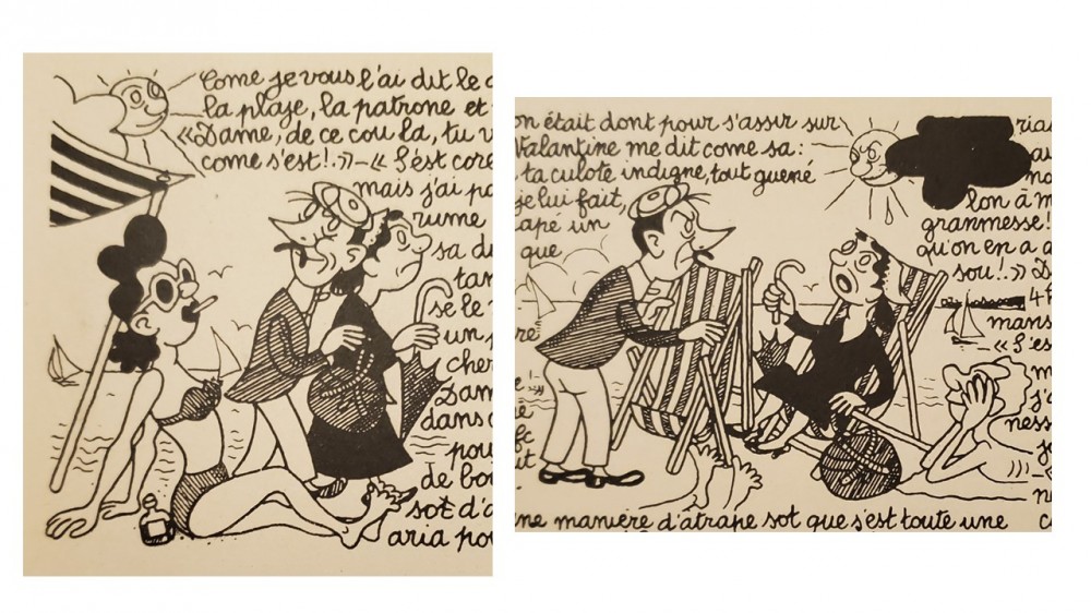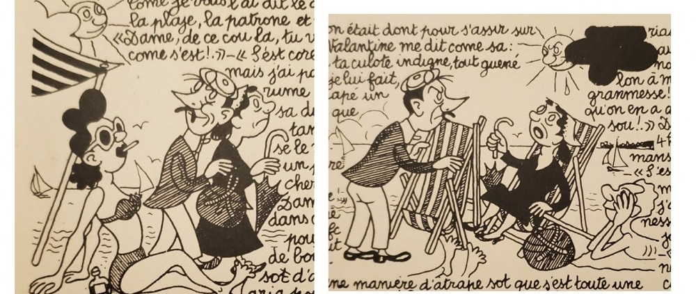 Un pique-nique dans les sapins, puis un petit tour sur la plage… Julien en costume, Valantine en robe noire et coiffe sur la tête ne manquent, bien sûr, pas d’attirer l’attention des vacanciers en maillots de bain. Les femmes fardées, dénudées, enduites d’huile solaire (oui c’est bien un petit flacon que vous voyez dessiné à côté du bras de la starlette !) semblent narguer le couple de réactionnaires.