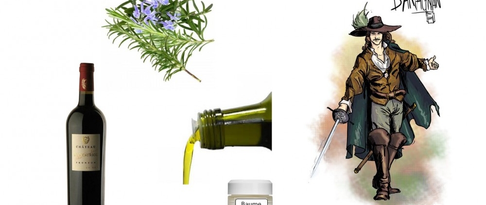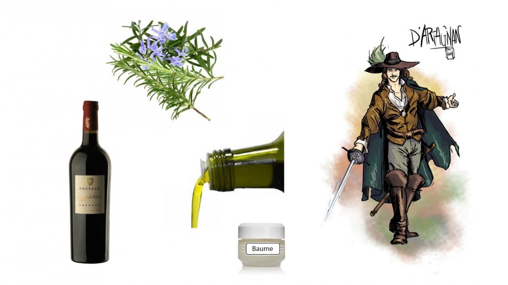 « Les trois mousquetaires » d’Alexandre Dumas, qui nous précise que d’Artagnan part à la conquête de Paris muni de fort peu de bagages (et comme tout le monde sait, « juché sur un bidet orange »). Dans ceux-ci, un baume-miracle dont la formule avait été dévoilée à sa mère par une bohémienne. Mélange de romarin, de l’huile et de vin, ce baume est susceptible de guérir, en trois jours, toutes les blessures, exceptées celles qui atteignent le cœur (au sens figuré ou au sens propre ?).