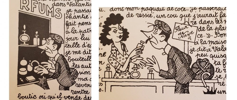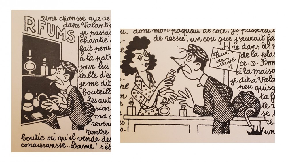 Voilà donc notre Julien qui entre dans une « boutic où qu’il vende des bricole pour les connaissansse » et qui se met à renifler les flacons débouchés, sous son nez, par une accorte vendeuse. Le prix est terrifiant : « 500 frans, une faillit burette come sa […] ». Oui, mais Julien, sous ses allures de dur à cuire, est un tendre, qui souhaite faire plaisir à sa femme. Le parfum est donc choisi, emballé, et mis de côté, le temps que Julien fasse le tour du pâté de maisons, histoire de s’hydrater le gosier.