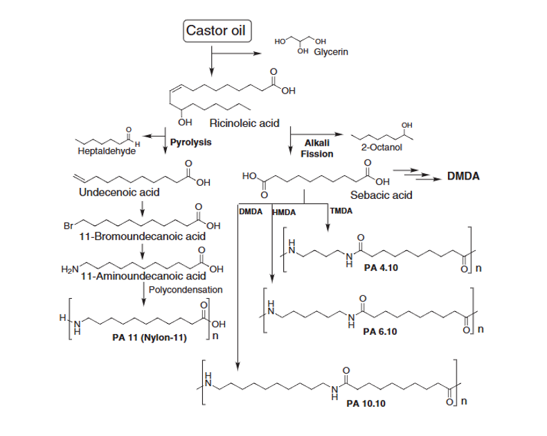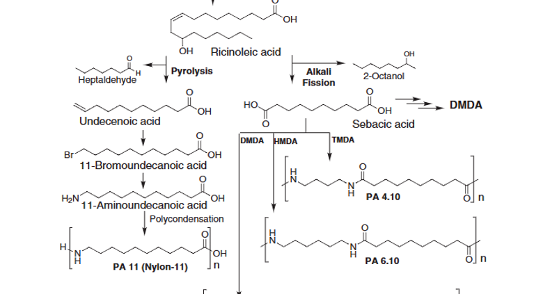 La réponse à notre question se trouve dans la littérature scientifique, puisque l’on y découvre que les polyamides « biosourcés » sont obtenus majoritairement à partir des graines de ricin extrêmement riche en huile et particulièrement en triglycérides renfermant un acide gras à 18 atomes de carbone, l’acide ricinoléique. Celui-ci va subir toute une série de réactions chimiques afin de donner naissance au polyamide-11 (également appelé nylon-11) et aux polyamides 4.10, 6.10 et 10.10 !5