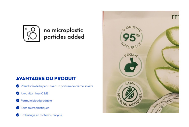 Cette solution épaissie, baptisée gel douche crème, nous garantit donc une douche relaxante, dans des effluves de vacances. Hygiène et voyage garantis ! Absence de microplastiques garantie ! C’est vrai !