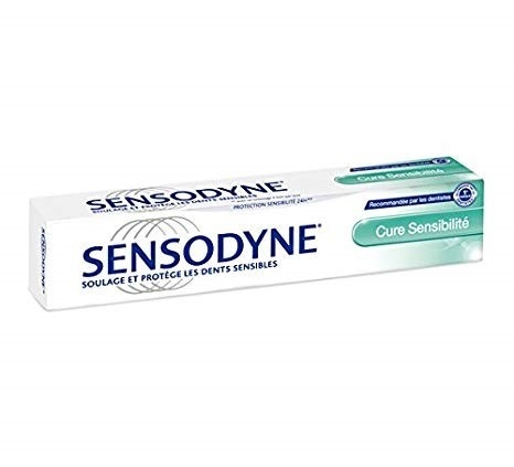 Sensodyne cure sensibilité : Aqua, sorbitol, hydrated silica, glycerin, potassium nitrate, cocamidopropylbetaine, aroma, xanthan gum, titanium dioxide, sodium fluoride, sodium saccharin, sodium hydroxide, sucralose, limonene. Contient du fluorure de sodium (1450 ppm de fluor).
